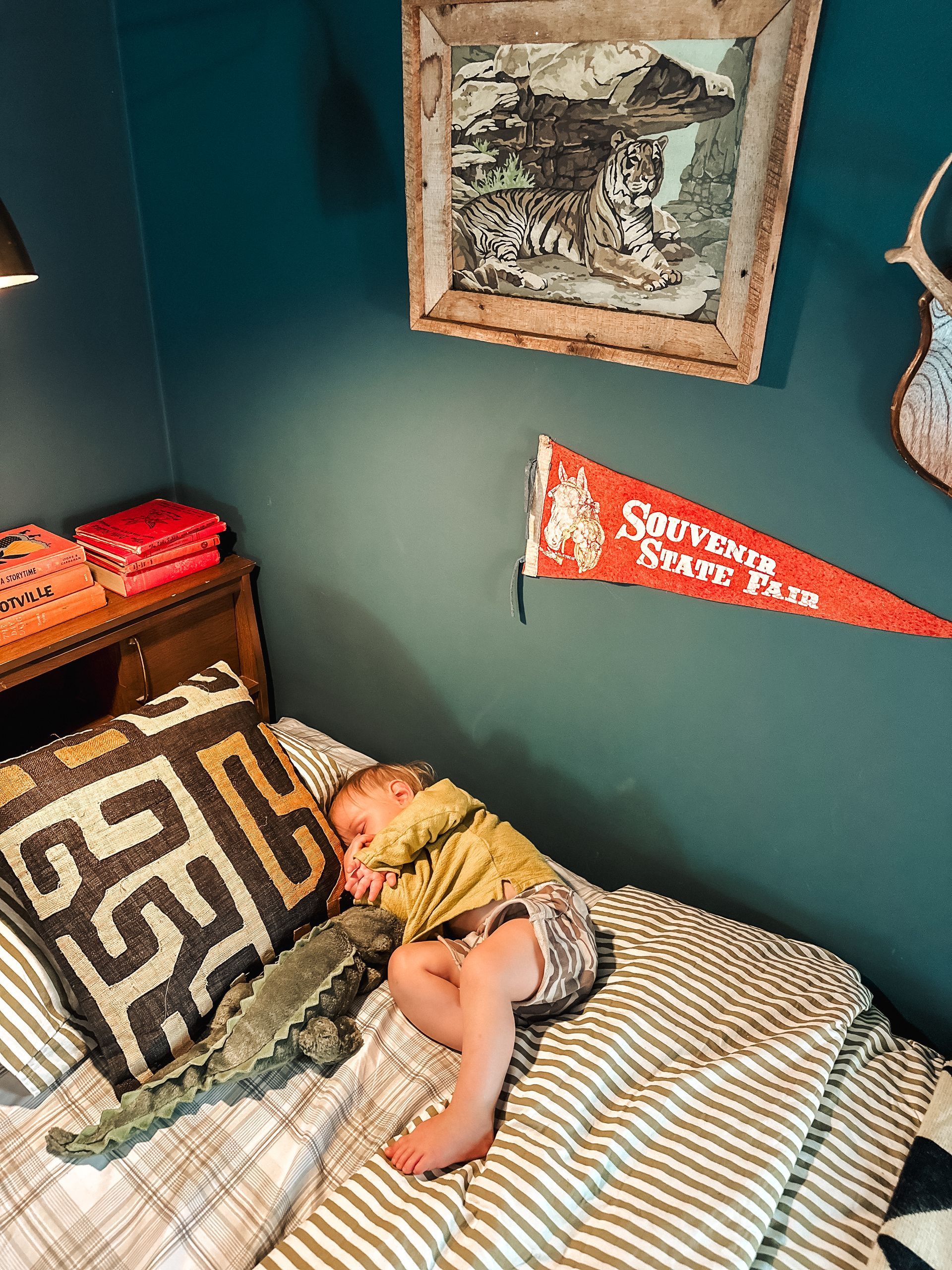 I get asked all the time why we have two beds, and it makes me wonder if I’m the only kid who grew up on twin beds?! I was raised by my grandparents, and my Maw Maw LOVES a twin bed set. My childhood room had twin beds, and this MCM pair actually came out of our family’s lake house. I have so many fond memories of playing tackle, reading books, coloring and sleeping on these beds growing up. They remind me a lot of my brother—who passed away in 2018. The headboards even make this distinct rattling sound that transports me straight back to my childhood and jumping on the beds with my cousins. These headboards mean so much to me, so it makes me smile that our boys will continue making memories with them.