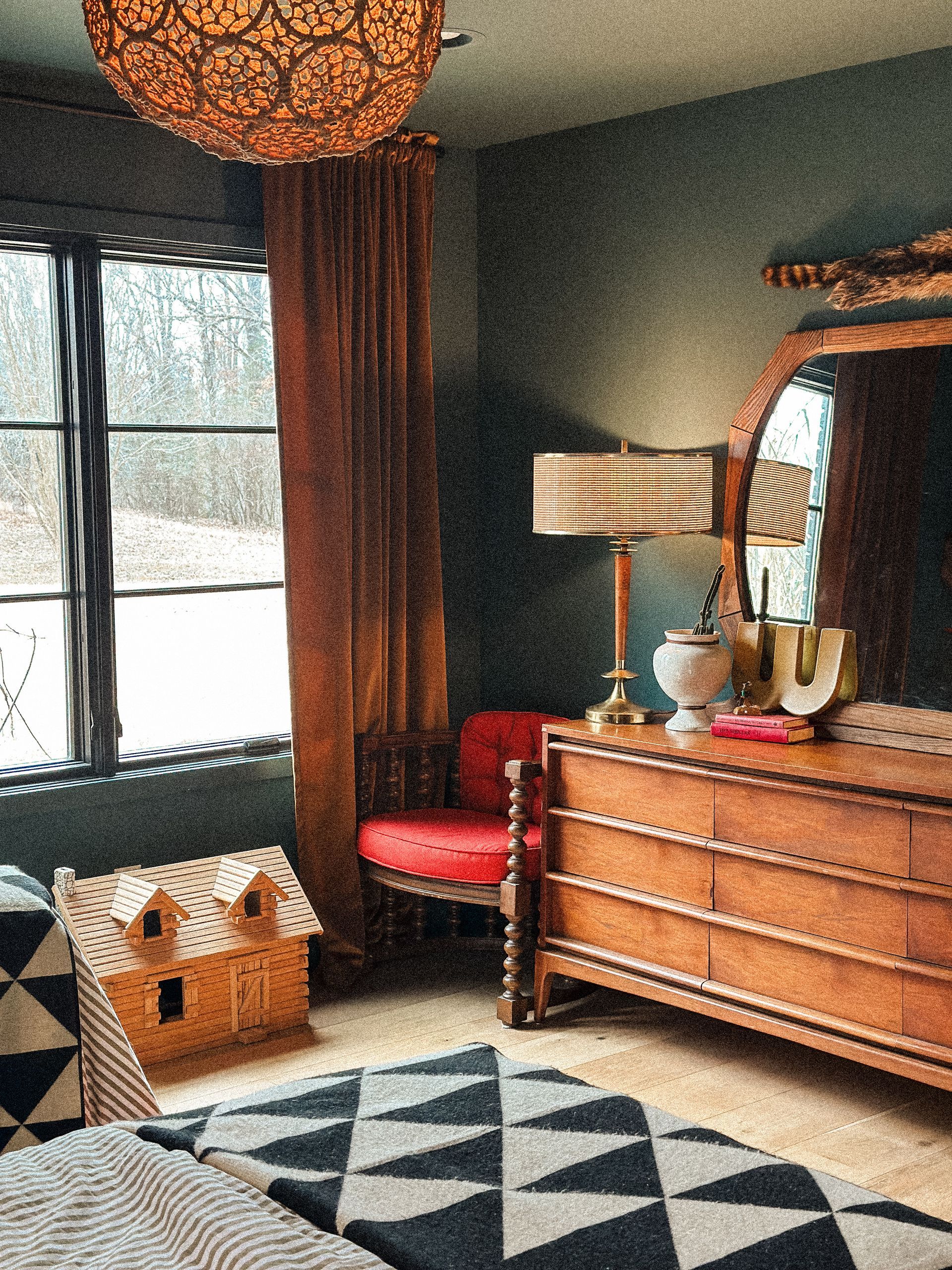 As always, so much of this room is thrifted! The pendant light, rug, dresser, lamps, mirror, spindle chairs, green chest of drawers, trunk, throw pillows, log cabin, old books and wall decor—ALL thrifted or found at antique stores or flea markets.