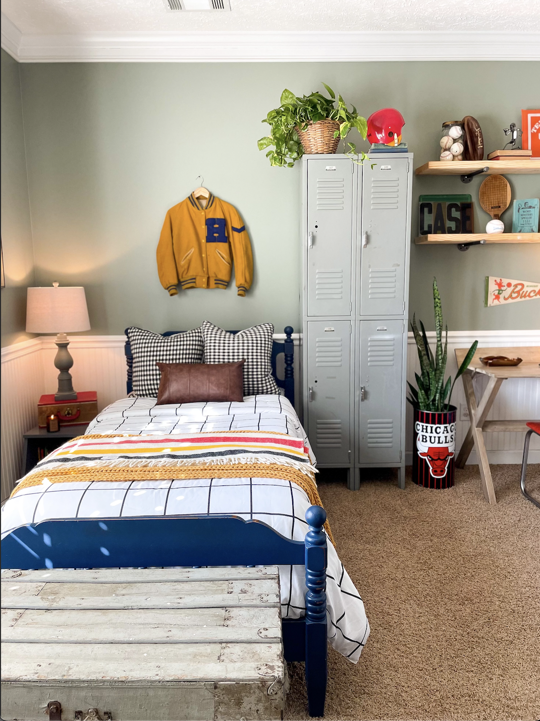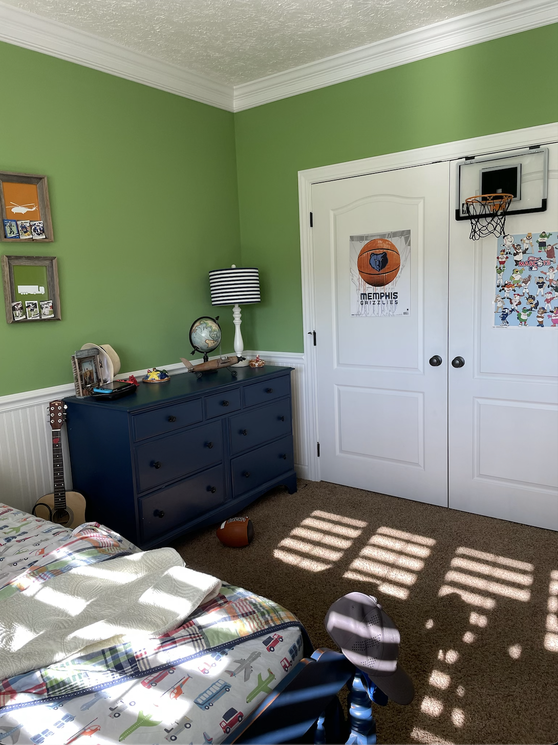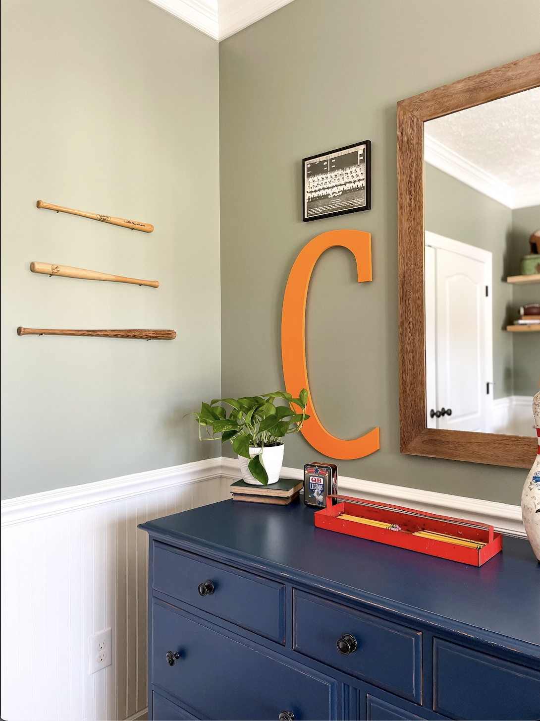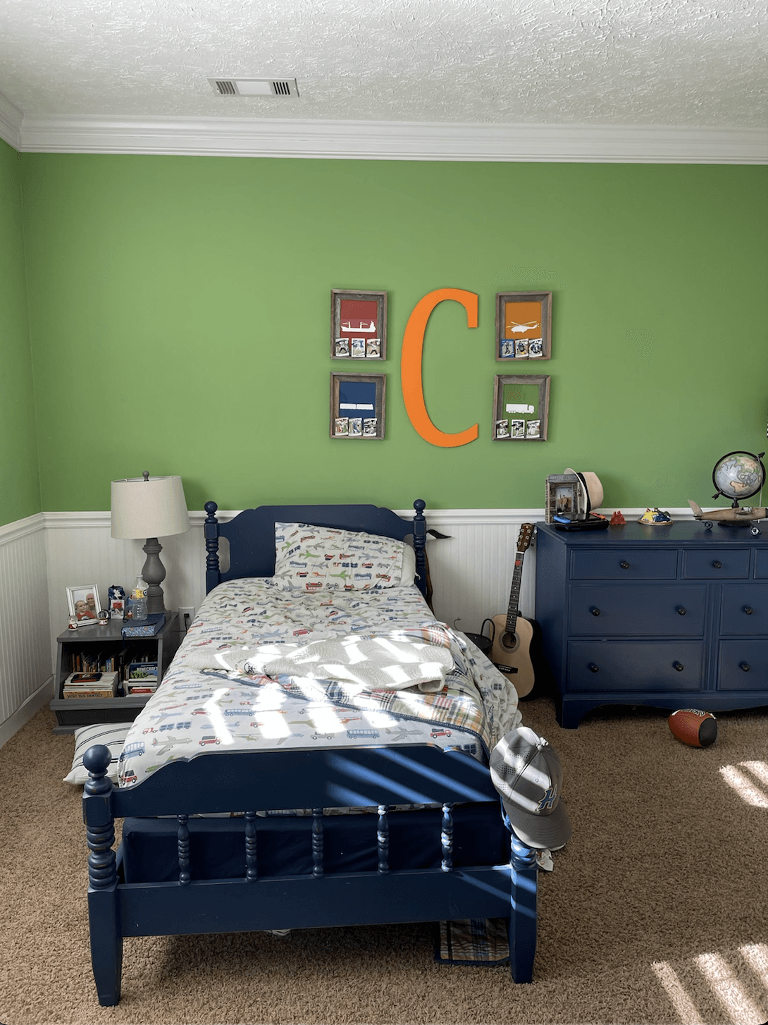 Decorating a room for a kid is just the best. I got the opportunity to put together a space for the funniest, most charismatic, sweetest little boy, Case. He is in the 5th grade, and he actually used to be one of my speech therapy kids! His mom reached out a few weeks ago to ask if I would spruce up the bathroom that her two boys share. When I went to their house to get my eyes on the bathroom, Case immediately wanted his room re-done! He was hilarious. He wanted the paint color changed, the “baby” curtains taken down, and he was OVER the juvenile transportation theme. He even started taking everything off the walls while I was there! When I asked Case what he wanted the new room theme to be, I should have known he would say SPORTS.