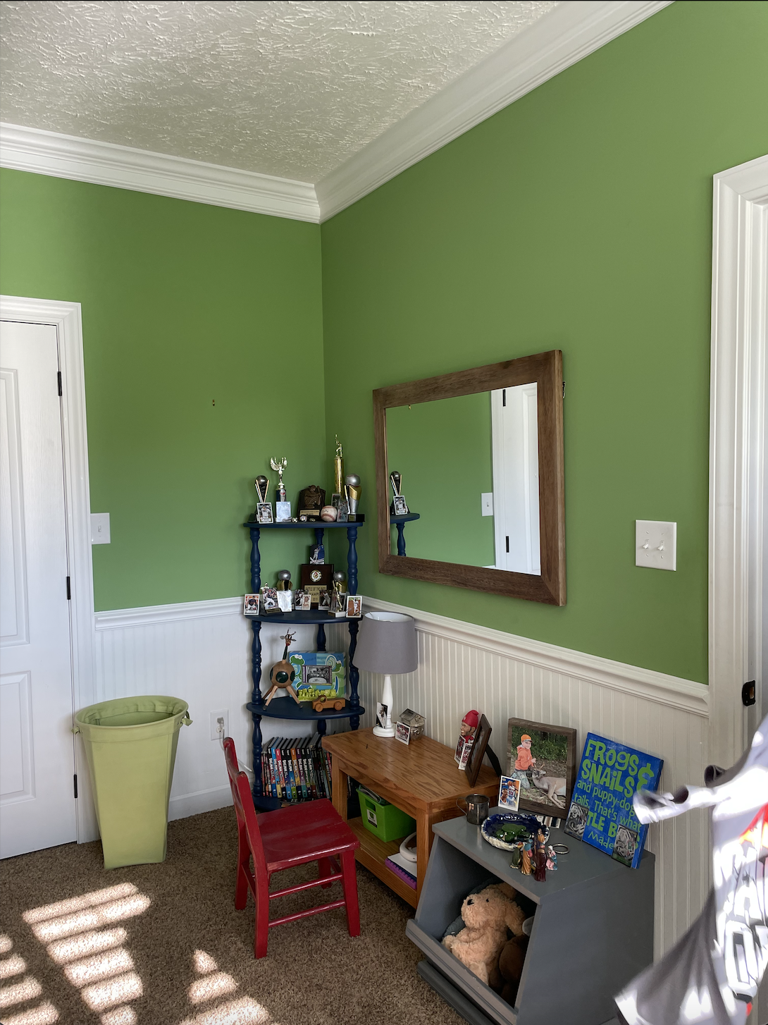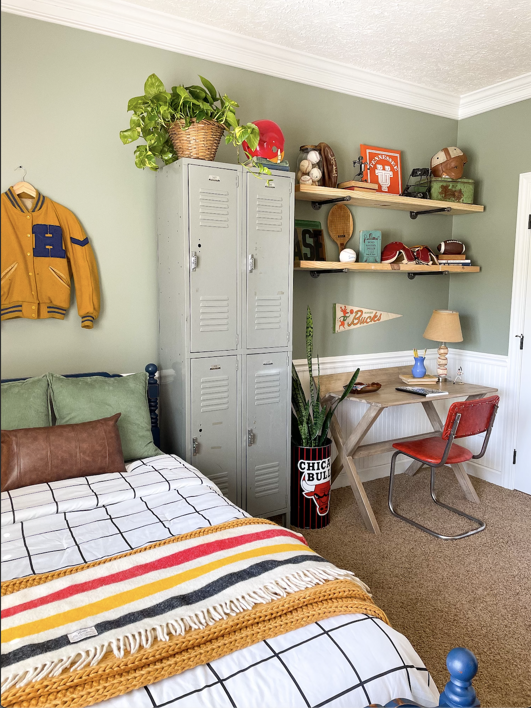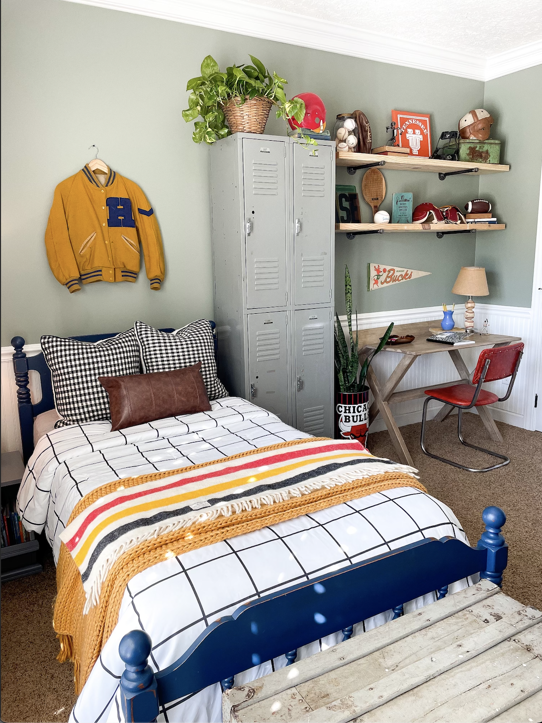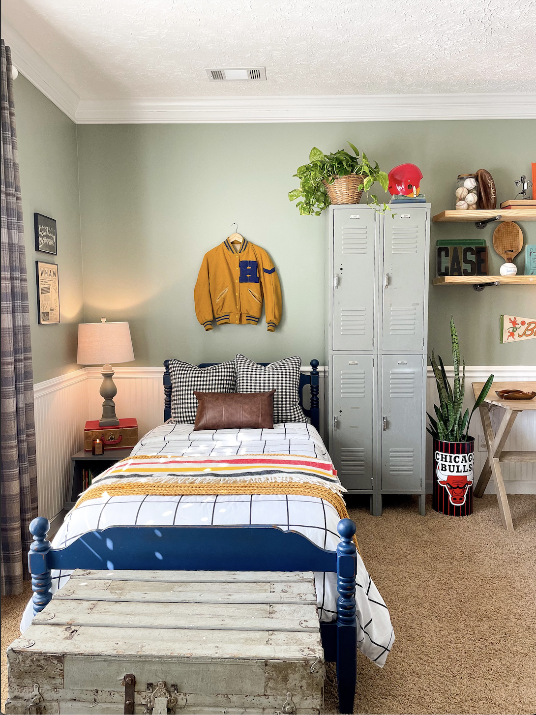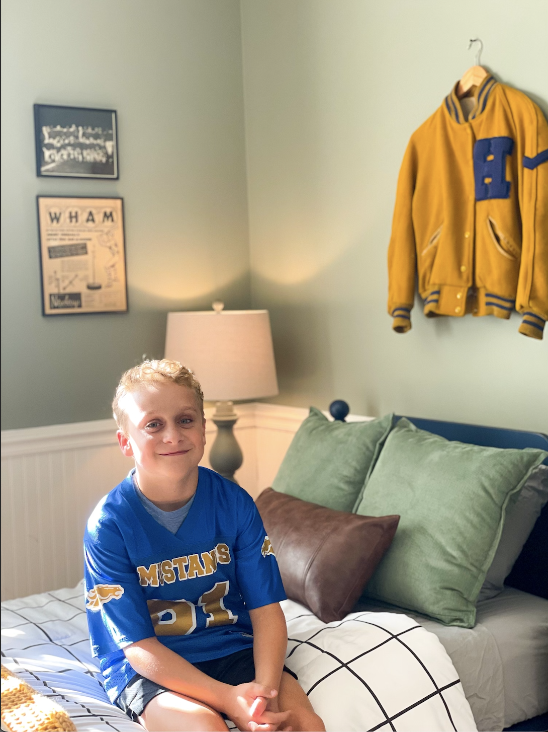 Decorating a room for a kid is just the best. I got the opportunity to put together a space for the funniest, most charismatic, sweetest little boy, Case. He is in the 5th grade, and he actually used to be one of my speech therapy kids! His mom reached out a few weeks ago to ask if I would spruce up the bathroom that her two boys share. When I went to their house to get my eyes on the bathroom, Case immediately wanted his room re-done! He was hilarious. He wanted the paint color changed, the “baby” curtains taken down, and he was OVER the juvenile transportation theme. He even started taking everything off the walls while I was there! When I asked Case what he wanted the new room theme to be, I should have known he would say SPORTS.