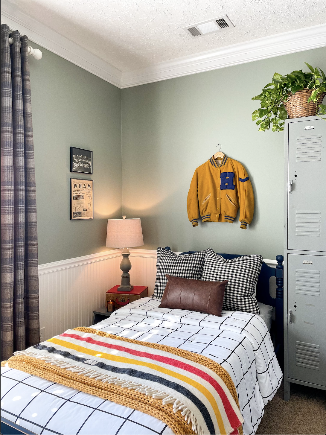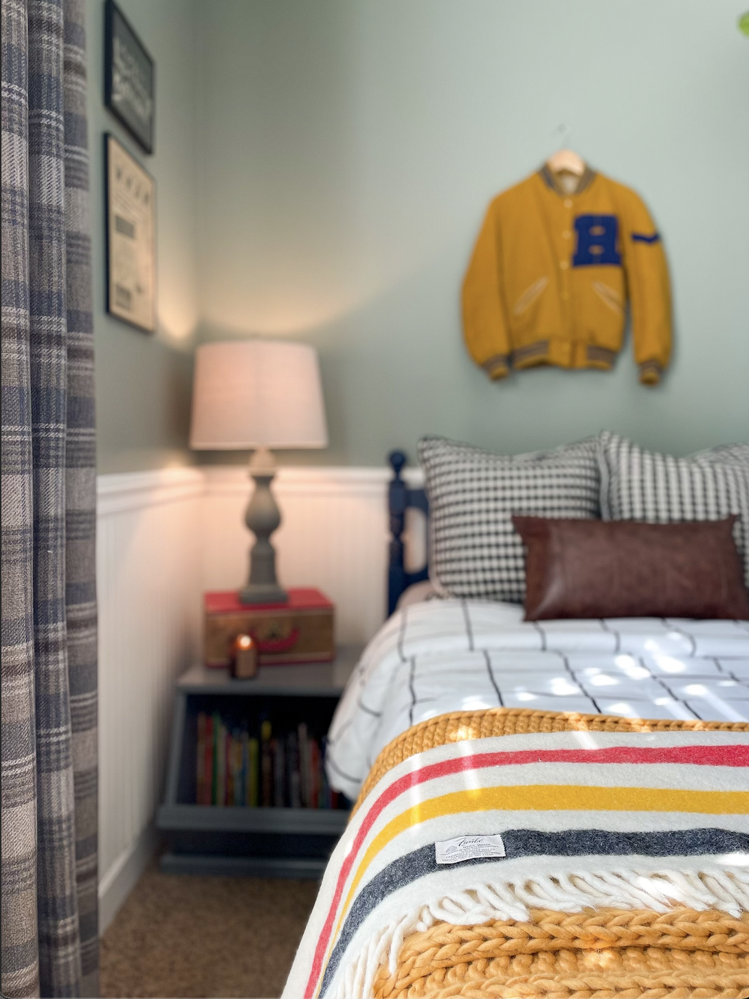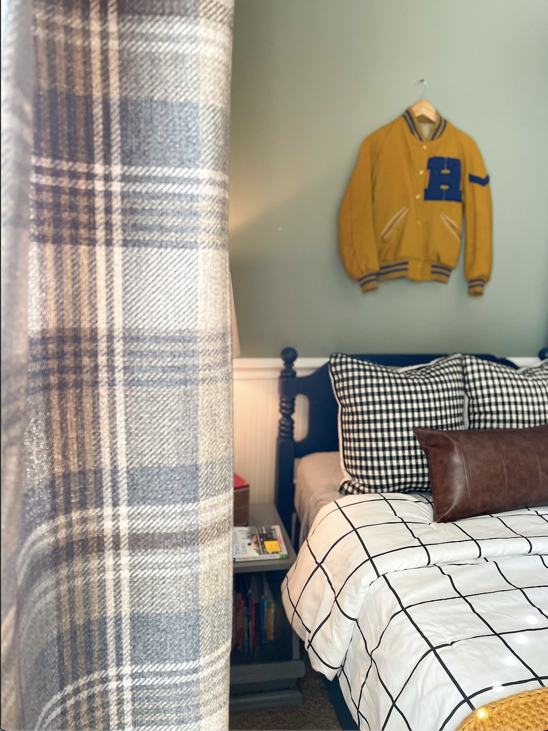 Funny story—two nights before install day, I had to collect some measurements in Case’s room. I realized then that I had not found curtains yet. Being the procrastinator that I am, I looked to Amazon and prayed that I could find curtains that would tie the whole space together. I knew I wanted plaid, but not a plaid that clashed with the windowpane bedding. I knew I wanted a soft color, but not too green, because I didn’t want them to blend with the wall too much. I found the perfect blend of gray, blue and white flannel curtains and ordered them. They came in just in time! I was very pleased with the thickness, quality, and texture. They look expensive but are actually pretty affordable for 95-inch curtains! You can find them here.