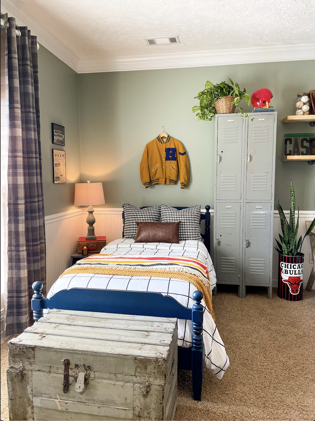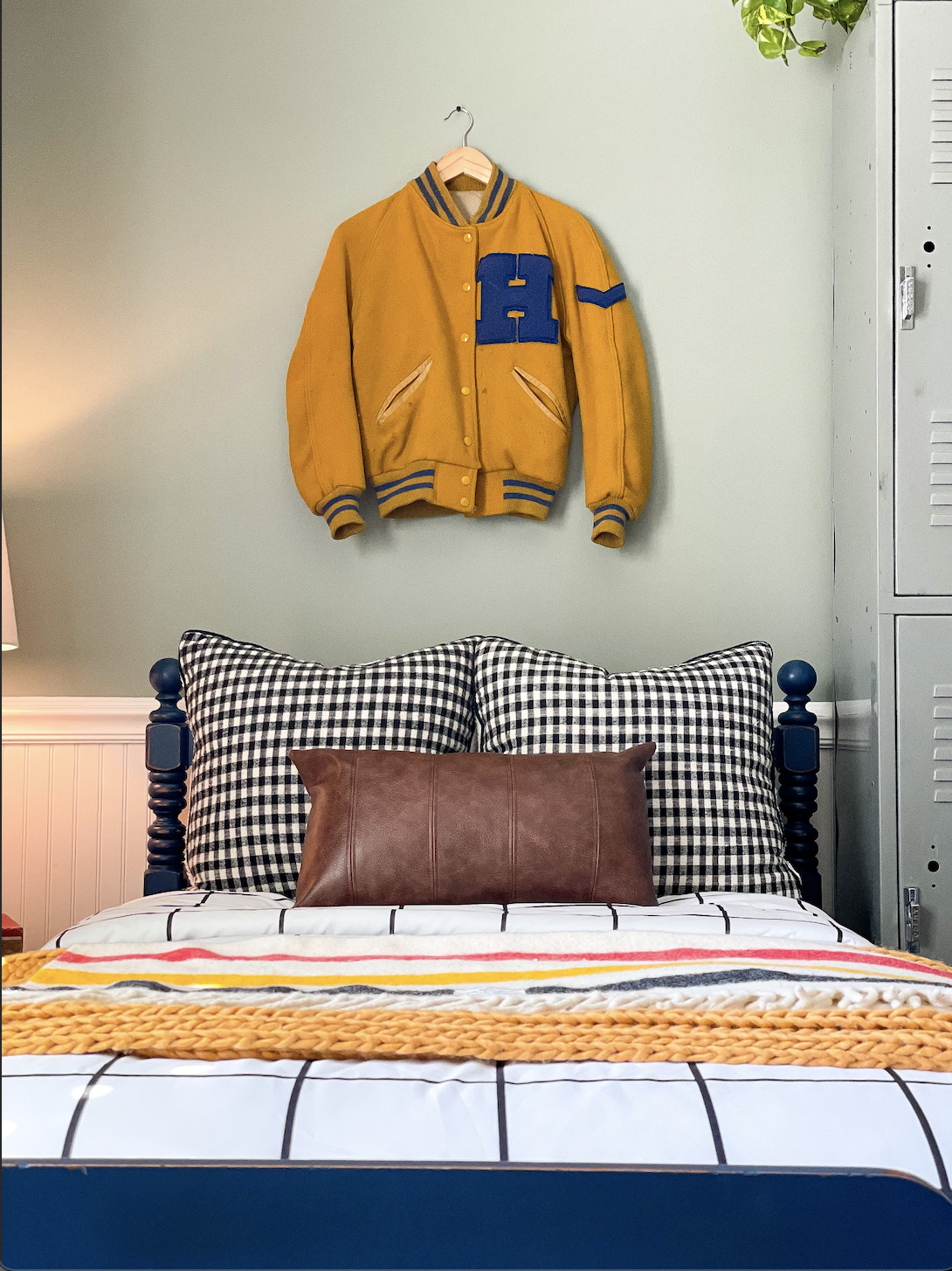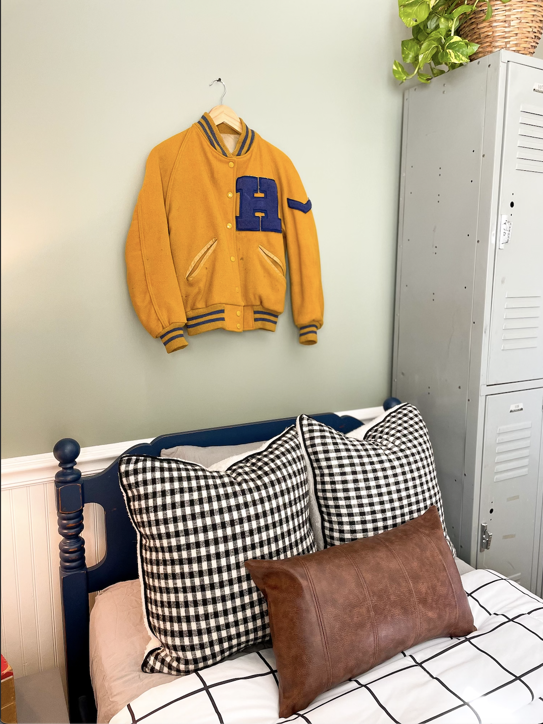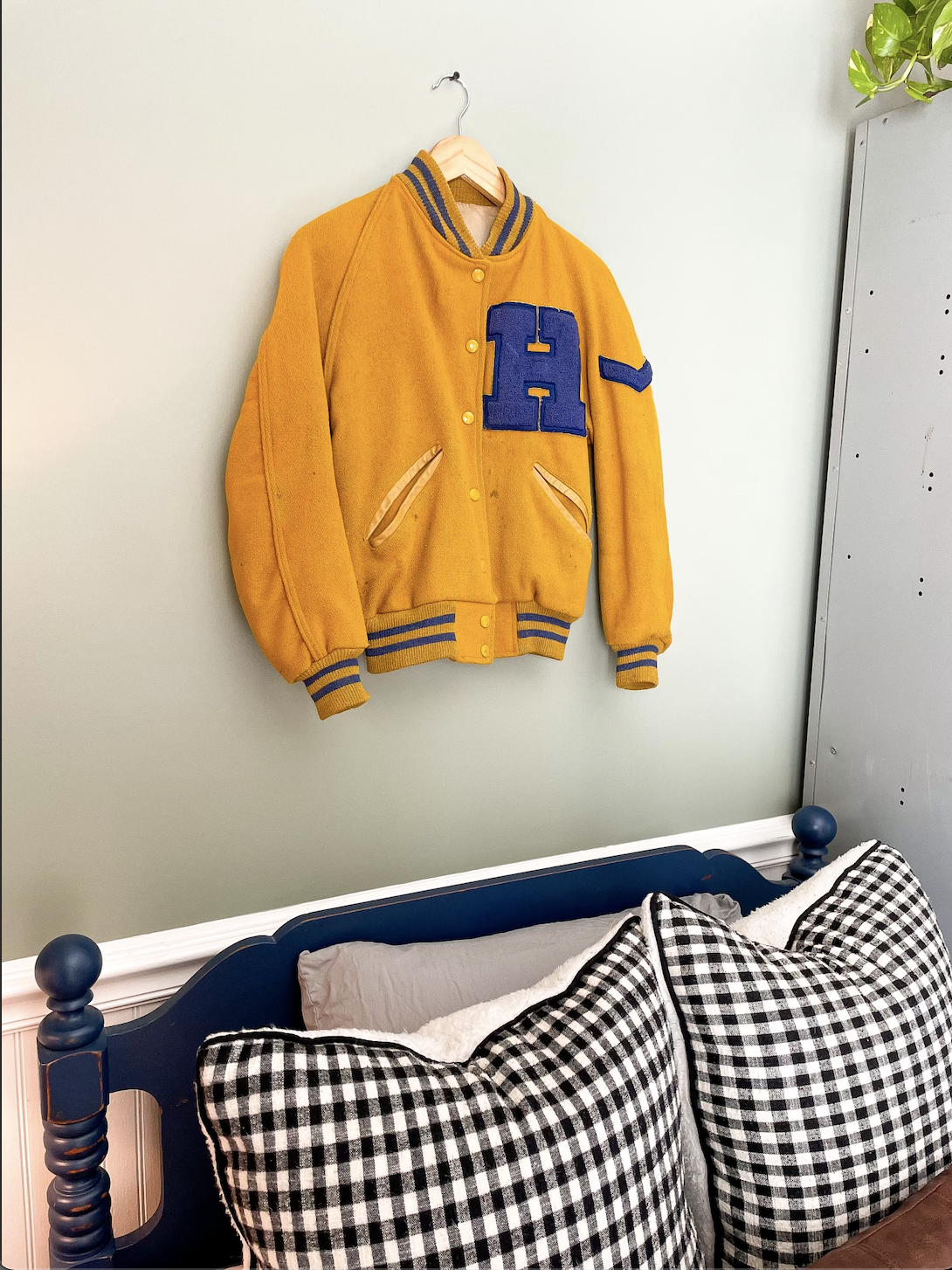 One last thing! The Huntingdon letterman jacket. Huntingdon, Tennessee is where we live and Case goes to Huntingdon Middle School. I picked through a house over a year ago and found that jacket. I have been hoarding it in the back of my store ever since, despite numerous interested buyers. I knew I would need it for something one day. I love the yellow pop that it adds, and it brings the whole sports theme full circle to include a piece of Case’s hometown.