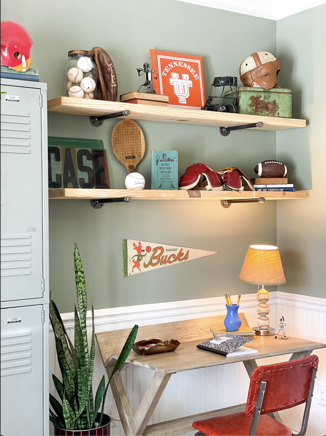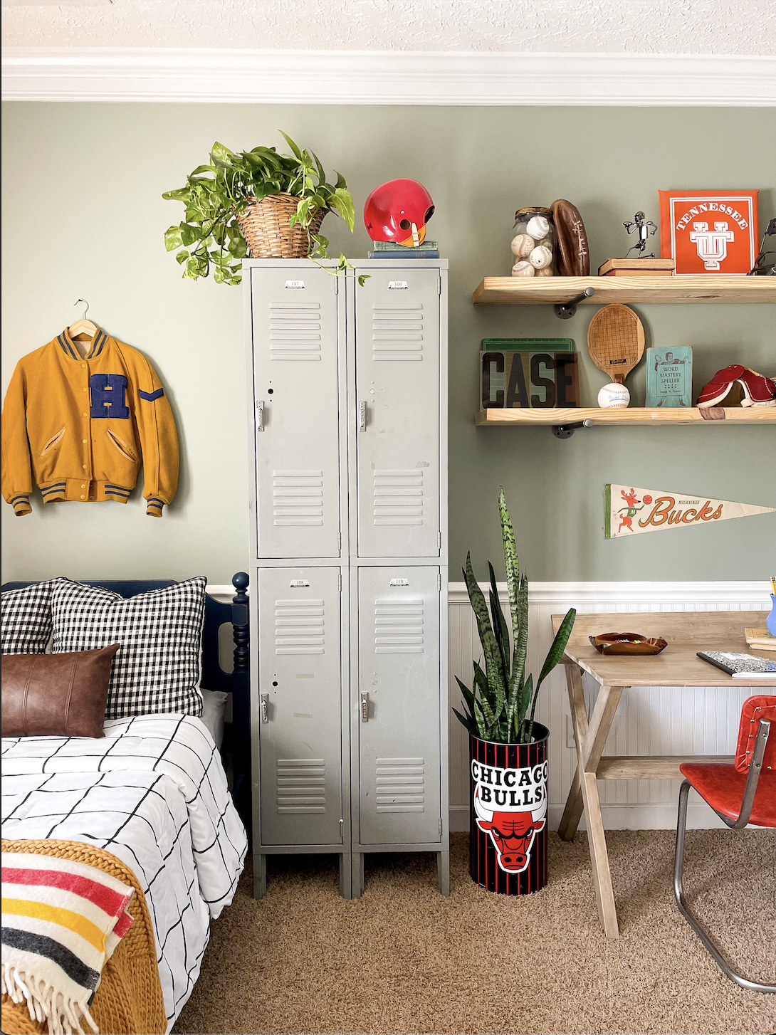 Over a couple of weeks, I found football helmets from the 50s and 60s. Baseball gloves from the 50s. Old photos of baseball, football and basketball teams. Vintage books, vintage bats, old baseballs, aged sports ads. I found the lockers on Facebook Marketplace and drove to Paducah, Kentucky to pick those up. I even found a really old bowling pin and ping pong paddle at Mantiques in Hazel, Kentucky. I thought those added an extra layer of fun and interest.