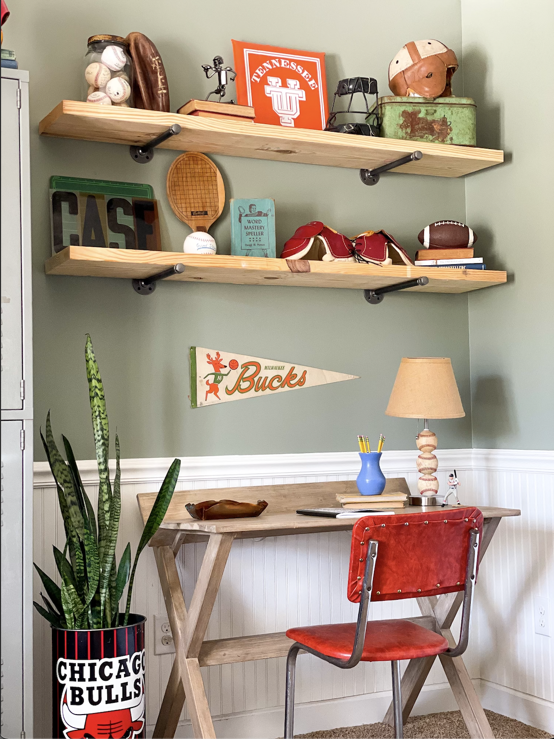 I am sitting in bed with my dogs at 9:30 p.m. after a long install day. We just put our son down, so I wanted to share about the vintage sports room I completed today!