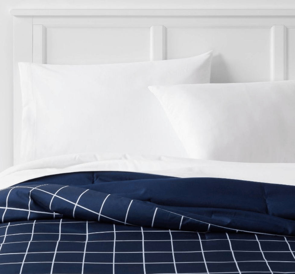 While I am an AVID supporter of buying secondhand, vintage, and thrifted items… sometimes, you just have to buy some things new. When it comes to linens, it is nice to have fresh, never-before-used pieces. The black and white windowpane comforter, gray sheets, and mustard kitted throw are all from Target. I had originally purchased two green corduroy throw pillows from Target, but I found the black and white gingham ones while going through items that Case’s mom wanted to get rid of. The client always appreciates when I can use things they already have and shave some money off the final invoice. You can find the links to the target items here.