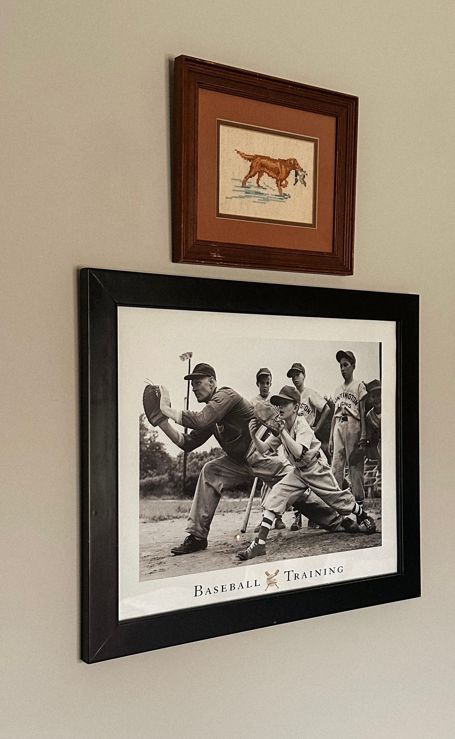I found both these pieces at a local antique mall. The black and white baseball photo shows a team wearing jerseys that say "Huntington Lions." I thought it was neat because we are the Huntingdon Mustangs. The vintage cross stitch is a golden retriever holding a mallard duck. Mac duck hunts and has a golden named Gunner!