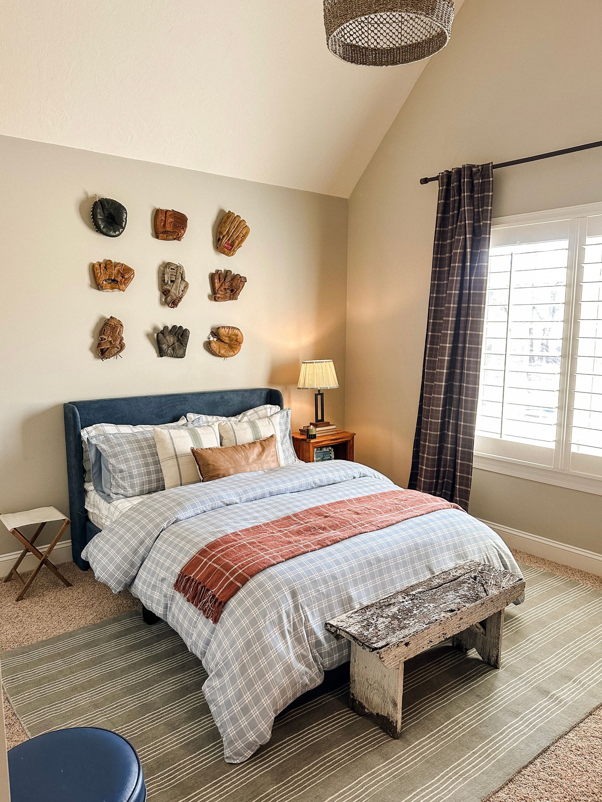 I love the bench at the foot of the bed and the texture it adds to the space. It reminds me of a bench you’d see in an old baseball dugout.