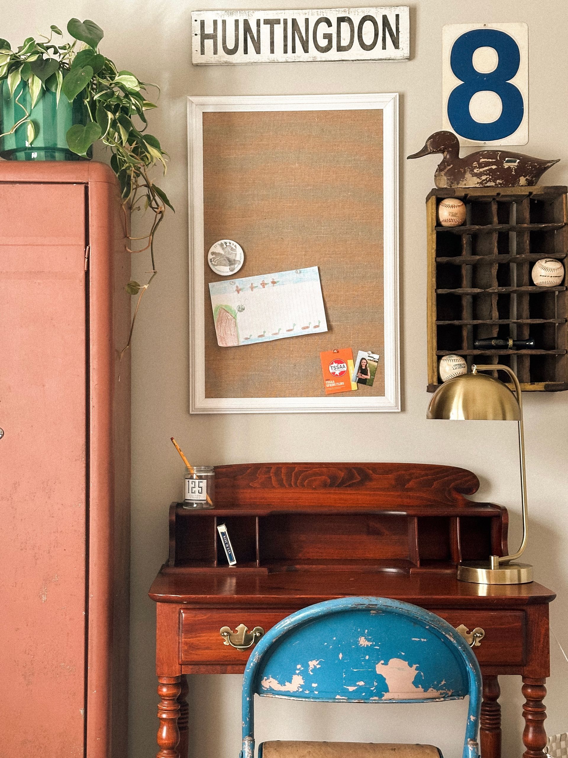 One thing Kelly really wanted was a space for Mac to draw. Mac takes after his dad in that he is very creative and artistic. I sourced this antique desk that has plenty of storage and shelves for knickknacks.