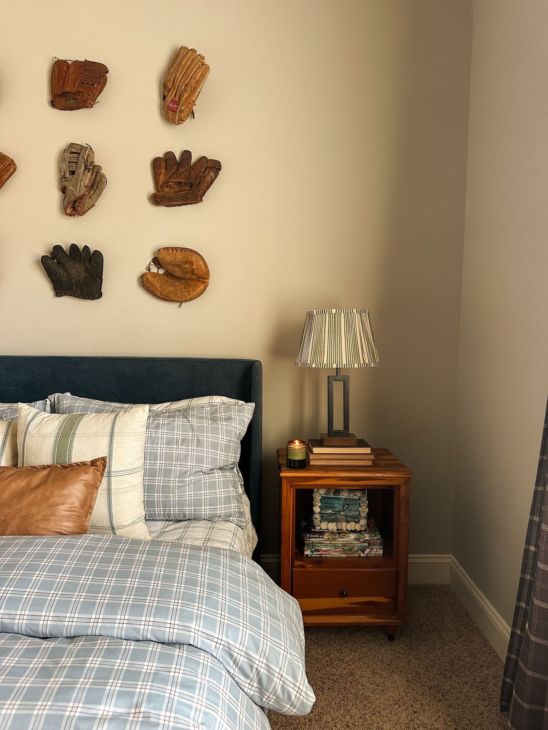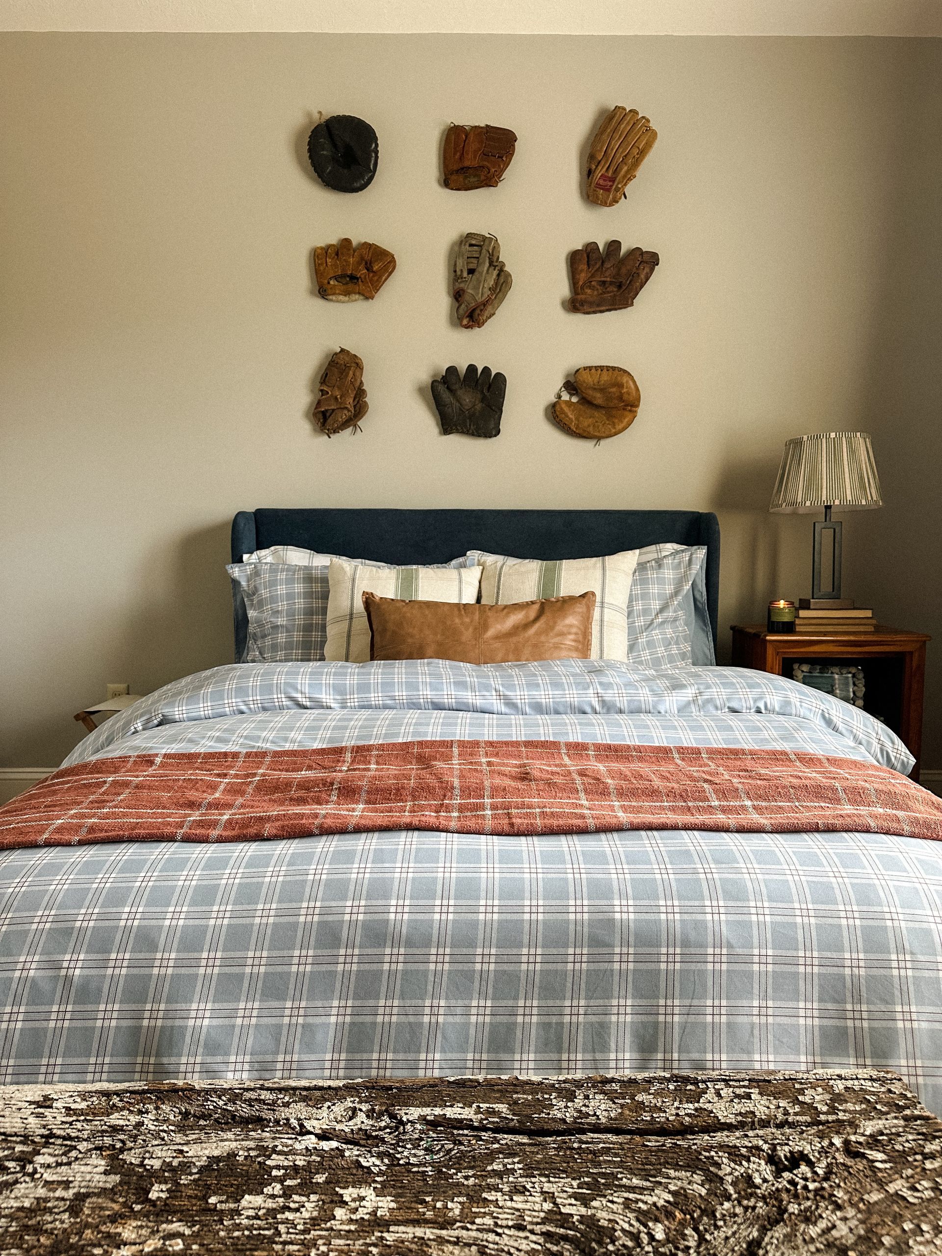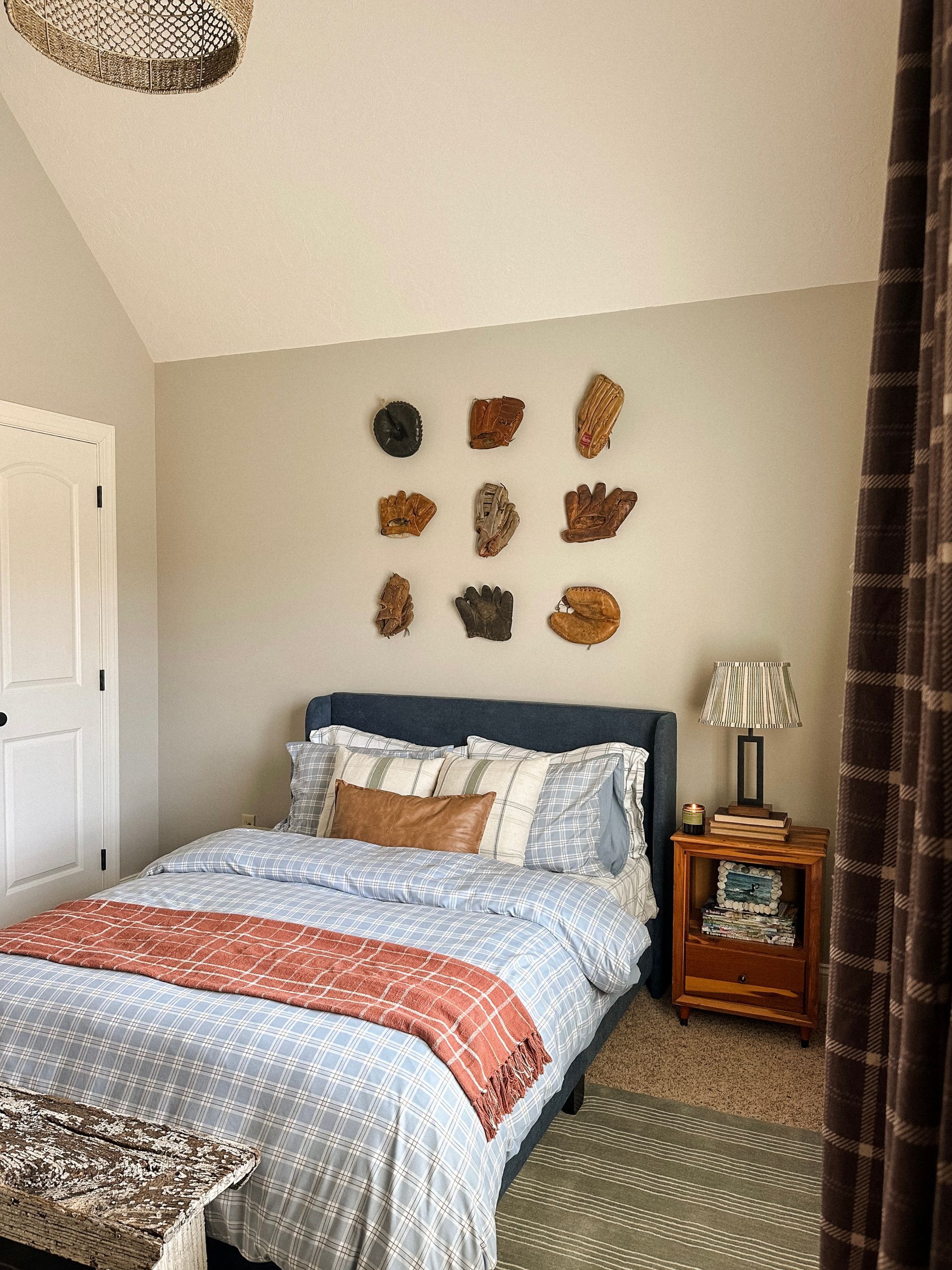 I always love to think outside the box when hanging things on the wall. We debated hanging an American Flag above the bed, but these baseball gloves ranging from 1930-1970 were so much more interesting. My favorite thing about the vintage baseball gloves: you can actually see the names of the previous owners written on some of them. I sourced most of these from my friend Cody and Lauren who own