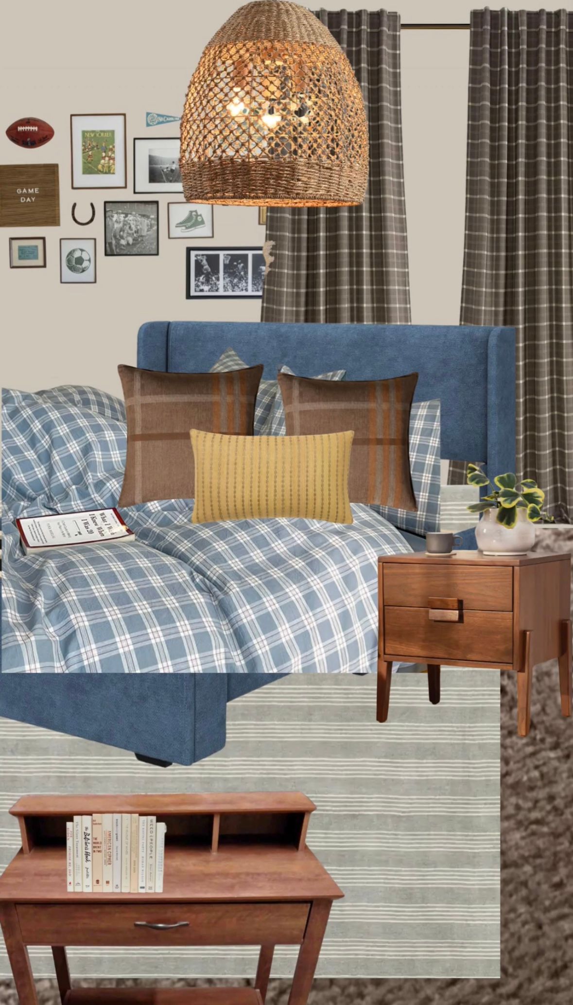 Mac’s number one rule for me: I could not use ANY red in designing this space because red is the color of our rival team. I sourced the old metal cabinet and throw blanket from a local antique mall, and Mac said I barely passed the color test, LOL. The two pieces have just enough of a brown-orange tint so that they work together in the space.