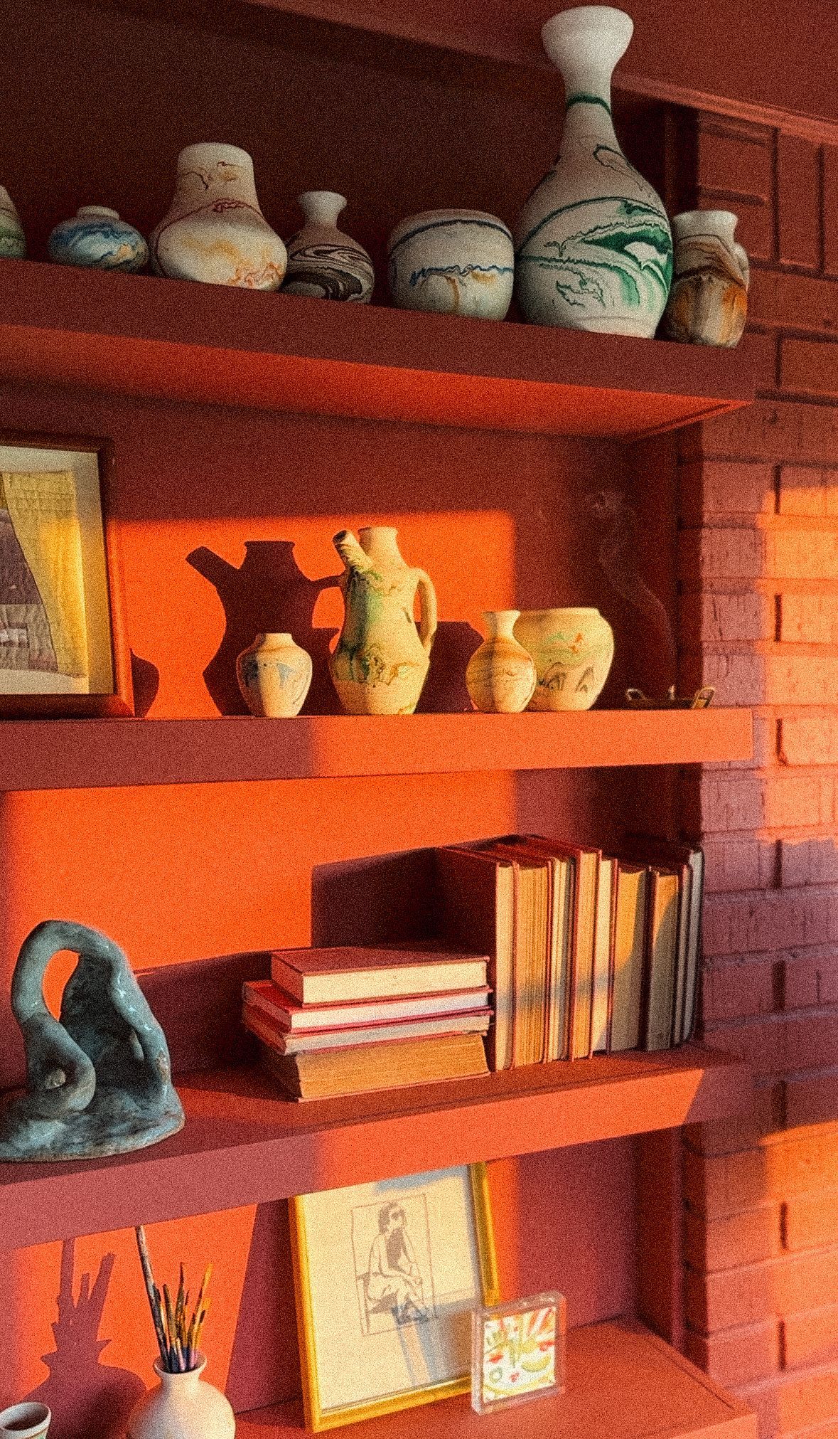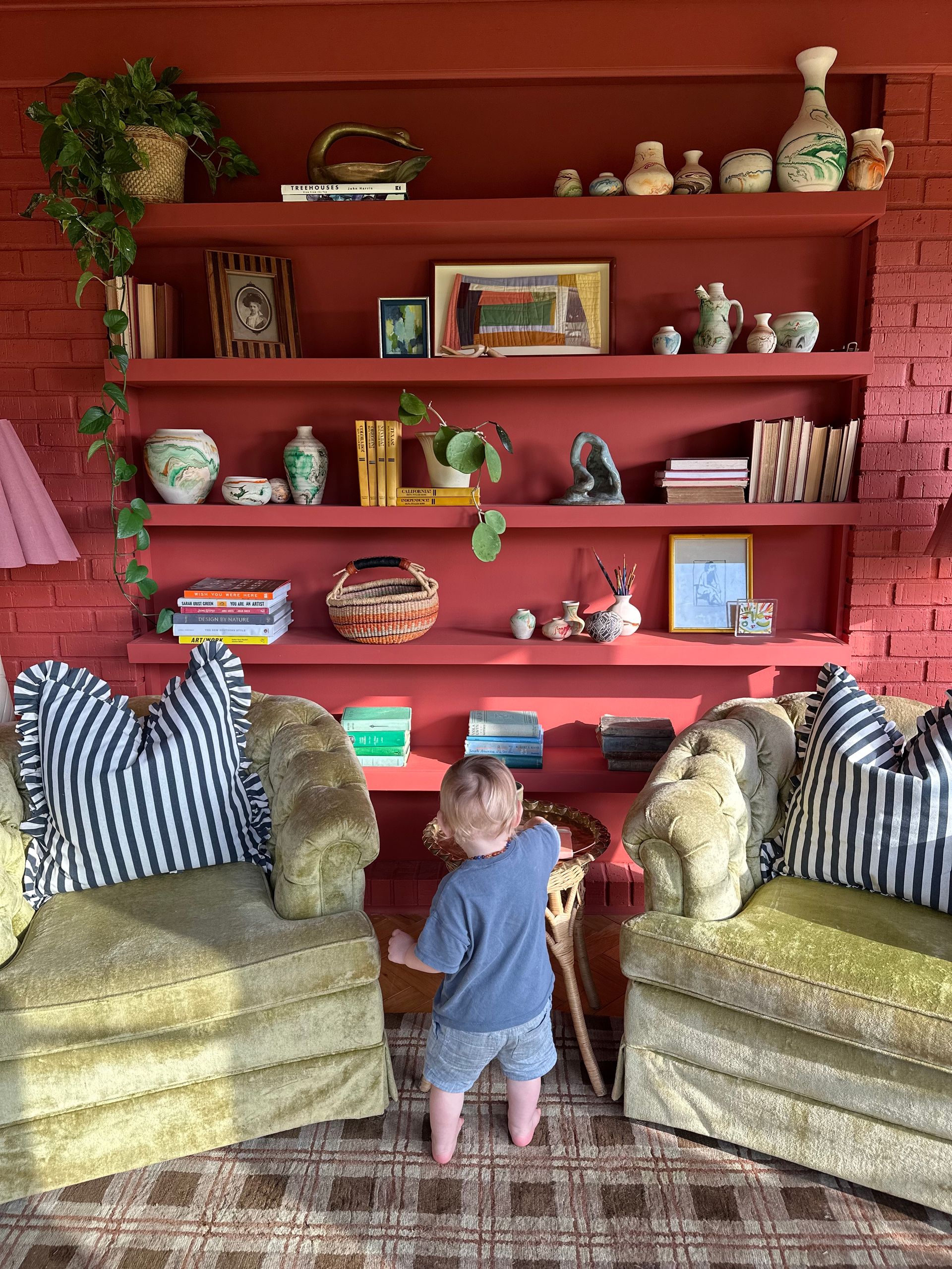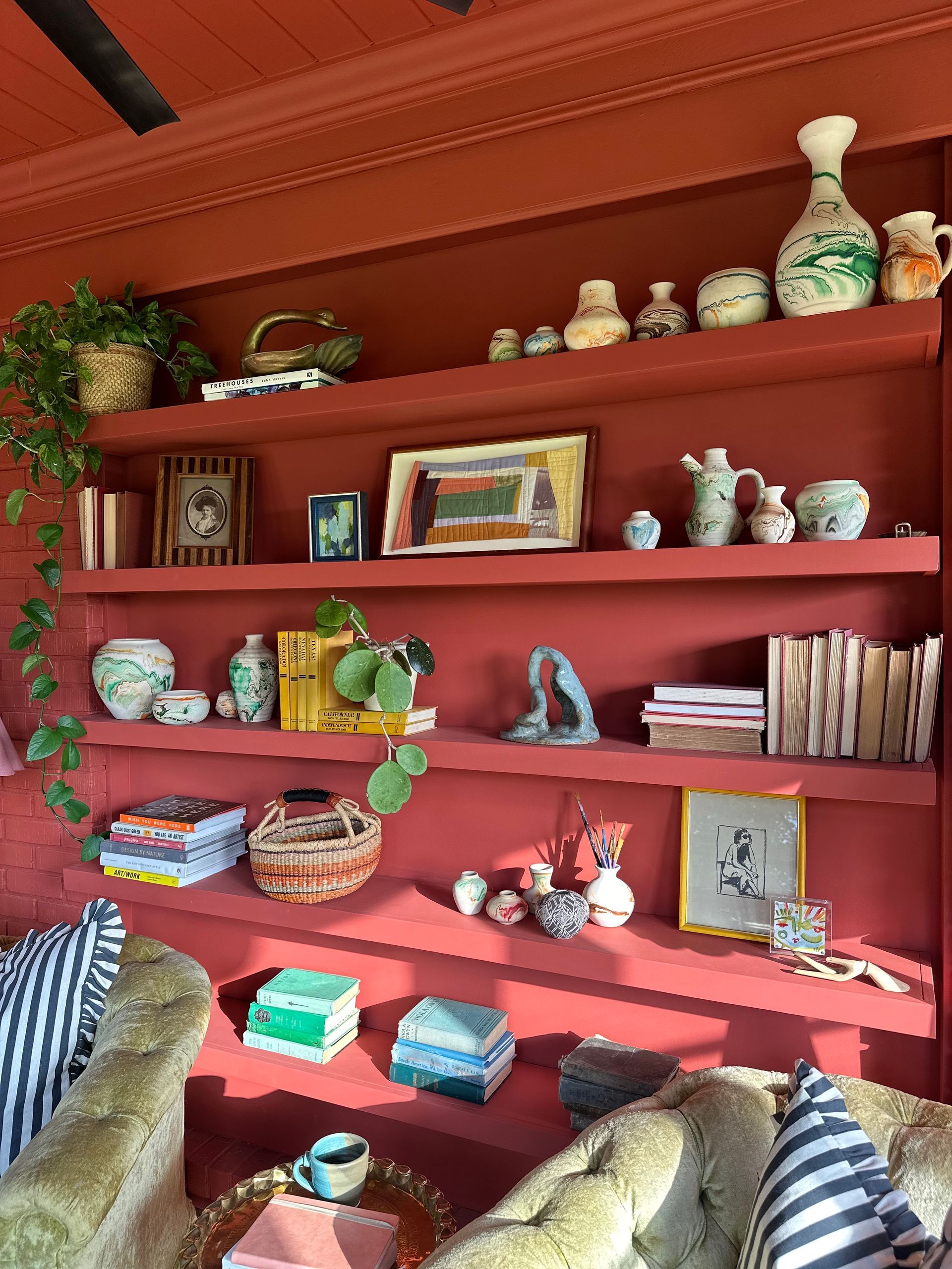 The open shelves actually cover the hole where a weird sliding door used to be. The sliding door went into a bedroom, but we made that bedroom into the mudroom/laundry room area. I absolutely love my open shelves, and you can’t really tell that it used to be a sliding door. They are filled with so many meaningful pieces. Almost every item has a story or was sourced on a trip. A lot of the art is handmade and even the plants are from my friends’ plant stores. However, the star of the open shelves has to be my Nemadji pottery collection. I started collecting this pottery when I began this thrifting journey 5 years ago. The bright colored swirls always catch my eye, and I never pass up a piece when I find one on my travels. This type of pottery is called “Indian” pottery, but it’s actually created in Minnesota and made to look like Indian pottery. They are getting harder and harder to find, but I’m happy with my little collection of 19 pieces. I was pumped to find 2 more vases just last week while antique shopping with the boys in Paducah, Kentucky!