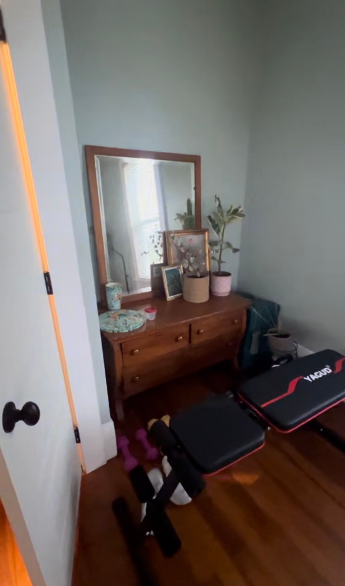 We originally thought we were going to make that left corner a cozy sitting area with a big chair, floor length mirror and floor lamp. One day I was at an antique mall in Union City, Tennessee (shoutout to The Gallery!) and spotted that amazing wooden desk. I immediately thought of Tamra and the little nook in this bedroom. We measured and it turned out better than I could have ever imagined. We decided to go with that velvet vintage chair so that it could be used as the desk chair, but also a reading chair if needed. It’s actually really comfortable! I got the round boucle pillow at Kirkland's in Jackson, but linked a similar one here.